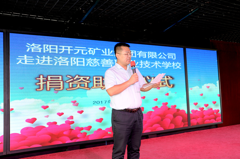 上午10點(diǎn)20分儀式開(kāi)始,集團(tuán)總經(jīng)理助理叢萬(wàn)通代表公司發(fā)表講話,他重點(diǎn)談到:近年來(lái),開(kāi)元礦業(yè)集團(tuán)在董事長(zhǎng)許明月的帶領(lǐng)下,強(qiáng)力推進(jìn)企業(yè)發(fā)展的同時(shí),積極開(kāi)展各項(xiàng)社會(huì)公益活動(dòng),在慈善愛(ài)心公益領(lǐng)域不遺余力,先后為汝陽(yáng)縣馬溝小學(xué),洛寧縣東宋鎮(zhèn)郭村小學(xué)、兒童福利院、興華鎮(zhèn)中心小學(xué),宜陽(yáng)縣紅斑狼瘡重病小女孩、文物保護(hù)維護(hù)等捐款捐物累計(jì)超過(guò)100萬(wàn)元。作為洛陽(yáng)慈善總會(huì)理事單位,得知洛陽(yáng)慈善職業(yè)技術(shù)學(xué)校部分學(xué)生還沒(méi)有統(tǒng)一的職業(yè)西服后,集團(tuán)立即聯(lián)系校方,為學(xué)校捐贈(zèng)60套校服西裝,價(jià)值9000余元;希望同學(xué)們將社會(huì)各界的關(guān)愛(ài)轉(zhuǎn)化為學(xué)習(xí)的動(dòng)力,積極回報(bào)社會(huì)。