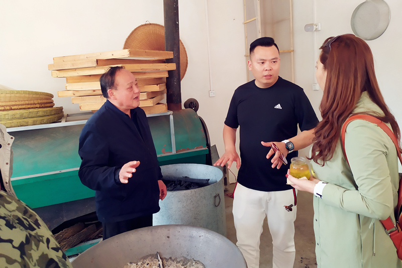 在這個秀美的山村里,周祖宏是個“名人”,他是周氏炒茶家族第四代傳人,憑著一手炒茶絕活,被河南省文化廳評為河南省省級非物質(zhì)文化遺產(chǎn)項目(信陽毛尖茶采制技藝)代表性傳承人。洛陽開元集團一行來到周老師家里,董事長許明月與周老師親切交談,對制茶、品茶、信陽茶文化等一系列問題做了相互交流。在手工茶坊里集團員工們也興致高昂地觀摩了炒茶師傅高超的手藝,手工炒茶可以使茶的營養(yǎng)成分更高,口感上偏濃,更加耐泡。大家品的是茶,吐出的是都市的困頓與繁雜。在300余畝的茶園中,縷縷茶香沁人心脾,在采茶工的引領下,全體員工愜意自得地體驗采茶的樂趣。